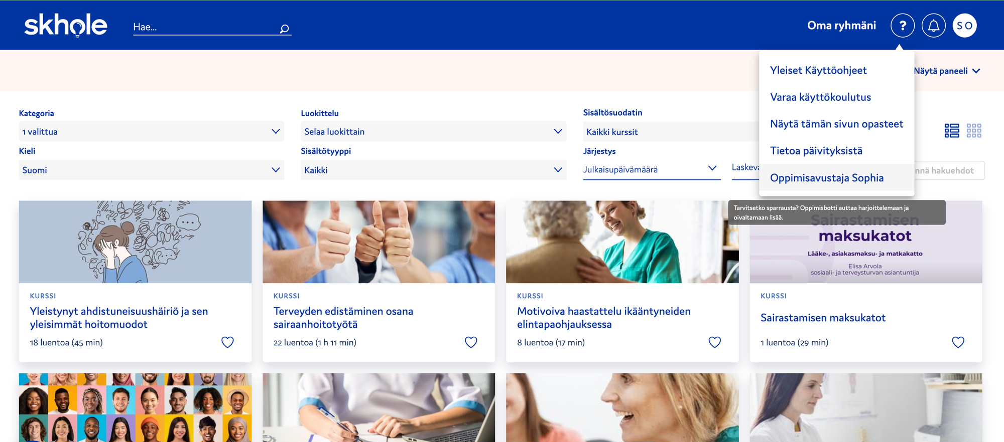Voit kokeilla Sophieta jo nyt Skholen oppimisympäristössäsi. Löydät sen oikean yläkulman kysymysmerkkivalikosta nimellä Oppimisavustaja Sophia.