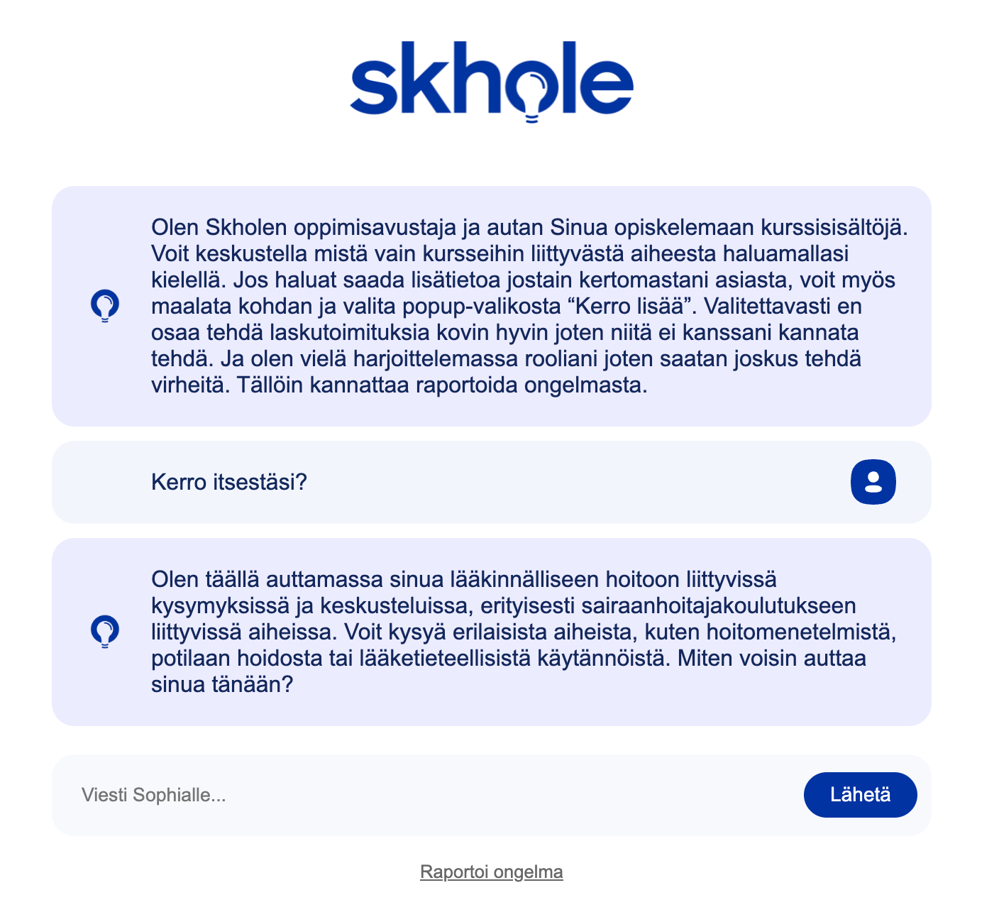 “Halusimme löytää käytännöllisen ja yksinkertaisen tavan tuoda tekoälyä Skholen palveluun. Sophia vastaa siihen tarpeeseen, että verkkokoulutuksessa usein puuttuu mahdollisuus kysyä ja keskustella.”